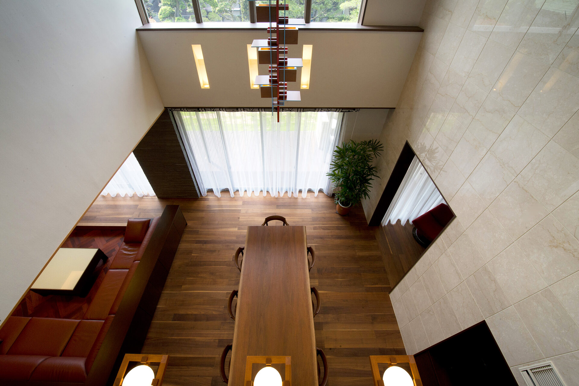 大きな吹き抜けと圧倒的な天井高、明かりが差し込むガラス張りの壁におのずと視線が上に向くダイニングスペース。シンボリックな照明が目を惹きます。ダイニングの8人掛け長テーブルはオーダーメイドで、床材と同じウォールナットを選びました。
